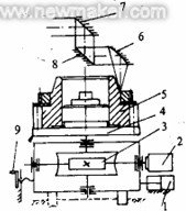 齒輪激光焊接機床由主機、激光器、冷水機組、輔助氣供氣係統、計算機控製係統等主要部分構成,圖6為(wei) 其結構示意圖。激光束由激光器產(chan) 生並水平送出,通過兩(liang) 個(ge) 45°角平麵反射鏡7、8傳(chuan) 輸到45°角反射式曲麵聚焦鏡6上,由其聚焦垂直照射到被裝夾在工作台4#p#分頁標題#e#上的雙聯齒輪5上,在焊接過程中,由平麵反射鏡8和反射式曲麵聚焦鏡6組成的激光頭固定不動,伺服電動機2通過蝸輪蝸杆副3驅動工作台4帶動雙聯齒輪作旋轉運動,使雙聯齒輪的齒輪和齒圈整個(ge) 接縫圓周都能被激光焊接。整個(ge) 數控工作台由氣缸1從(cong) 上料位置推到焊接位置,焊接位置的精確定位通過手柄9調整得到,激光頭在垂直方向可以連續調整,這樣,通過調整激光焦點與(yu) 焊縫的位置可以焊接不同規格的齒輪。