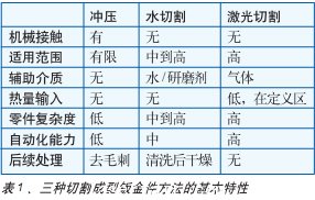 一種頗具前景的額外解決(jue) 方案是激光切割配合簡單的機械手係統。該方案提供了高度的柔性和無接觸高速切割,不會(hui) 產(chan) 生對工件的機械應力或壓力。此外,它使激光束能夠加工更多的材料,高功率密度意味著切割口附近的熱影響區非常低,光點尺寸之小(通常小於(yu) 0.3mm)使其能切出極小的切口寬度。表1提供了對衝(chong) 壓、水射流切割和激光切割的總覽。