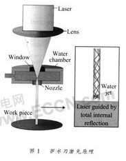 從(cong) 圖1可看出激光束(Laser Beam)由上方導入,經過聚焦鏡及水腔(Water Chamber)的窗戶進入,聚焦於(yu) 噴嘴(Nozzle)的圓心.