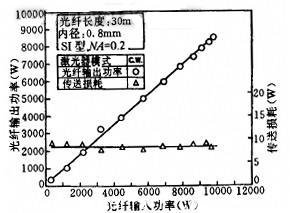圖1示出采用30m光纖傳(chuan) 送l0kWYAG激光時的光束傳(chuan) 送特性。從(cong) 圖中可以看出,入射功率10kW時傳(chuan) 送損失約800,大部分傳(chuan) 送損失都是由光纖端麵的反射引起的。采用YAG激光器時,反射光近800W,這種處理很重要。采用該係統時,處處都要注意不要因反射光而使係統本身受到損傷(shang) 。