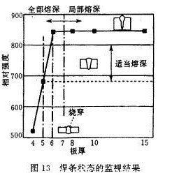 圖11示出焊接輸出的監視結果與(yu) 熔深深度的比較。從(cong) 此結果中可以看出,熔深深度變化0.4mm時,就可探測到輸出功率100W左右的焊接變化。圖12示出焦點位置和YAG激光器反射光及熔深深度的關(guan) 係。這裏雖然采用焦點深度Bf=200mm的大透鏡,但是可以探測士4mm的熔深變化。圖13示出穿透和未穿透時的發光強度變化。穿透焊接時,因為(wei) 熔融金屬在板內(nei) 穿過,所以發光強度下降,於(yu) 是就能探測到可以獲得穩定的內(nei) 部波焊道的狀態。