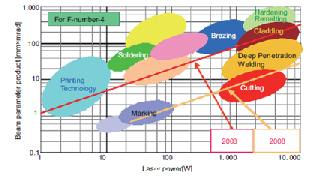 圖2:大功率半導體(ti) 激光器的光束質量與(yu) 輸出功率之間的關(guan) 係以及目前的應用領域。
