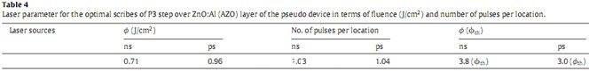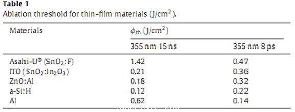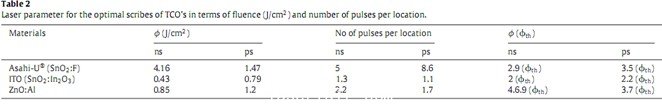 表 2 依據能量密度和每個(ge) 位置的脈衝(chong) 數確定的用於(yu) TCO的優(you) 化刻蝕激光參數