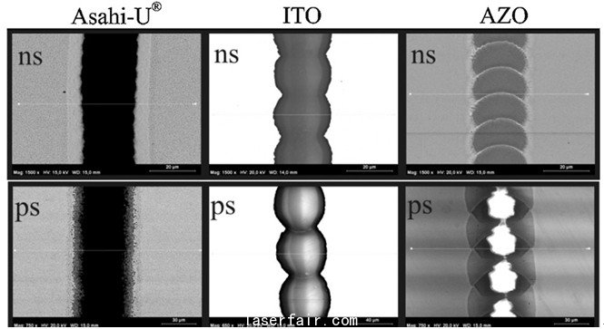 在第一步中評估了三種TCO:Asahi-U, ITO和AZO。表 2 給出了依據實現加工的必須的能量密度和脈衝(chong) 數。圖 4 給出了與(yu) 表2 中激光參數相應的劃線的掃描電子顯微鏡圖像。