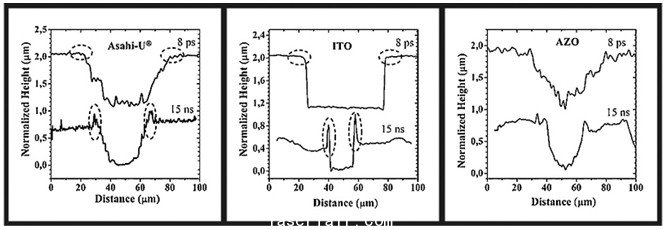 最後一步,從(cong) 薄膜邊緣獲得激光整體(ti) 互聯是激光劃線使靜合接點的隔離。矽結構上AZO層的完全去除用兩(liang) 種脈寬實現了,並且加工參數由表4 給出。圖 給出了ns和ps輻射的最佳劃線效果。這些圖片說明了電池上TCO疊層的選擇性燒蝕成果。