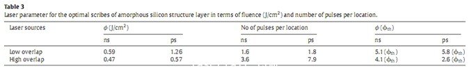 表 3 依據能量密度和每個(ge) 位置的脈衝(chong) 數確定的獲得非晶矽層最佳劃線效果的激光參數