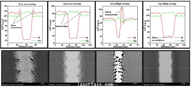 兩(liang) 種激光光源在沒有損壞底層#p#分頁標題#e#TCO的情況下,完成了對非晶矽層的完全消融。這個(ge) 過程用能量彌散x射線探測器進行了微量分析。表 3 給出了兩(liang) 種不同輻射,在兩(liang) 個(ge) 不同速度下獲得最佳結果激光的參數。實驗發現,對ps輻射,在低重疊的情況下需要更多的能量,而當能量密度與(yu) ns脈衝(chong) 相近時,則需要更多的脈衝(chong) 數。此外,在這種情況下對刻槽的形態麵貌以及材料去除和底層損壞的評估是非常重要的。圖 5 給出了ns和ps輻射情況下的最佳劃線。