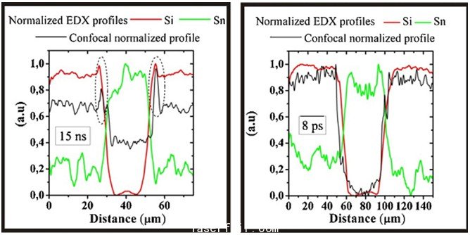 圖 6 ns和ps輻射下a-Si:H(pin)/Asahi-U/玻璃的激光最佳劃線的共焦和EDX剖麵
