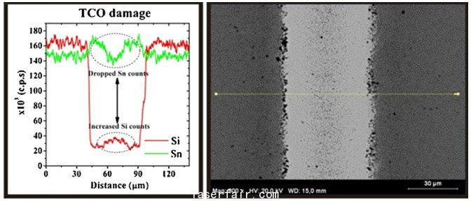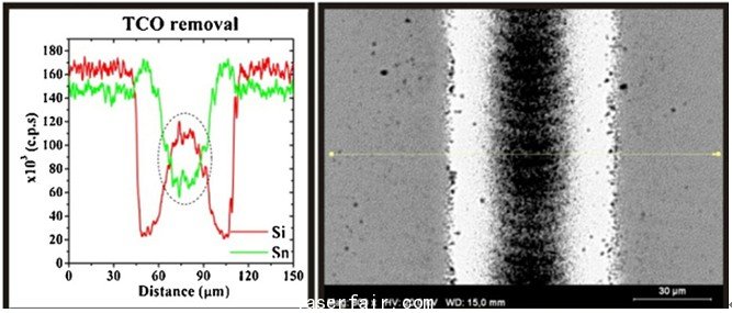 為(wei) 了使凹槽邊緣的矽沉積物與(yu) 它的實際高度相對應,圖 6 給出了最佳劃線的共焦和EDX剖麵。圖 7 中的EDX剖麵,顯示了在第二步加工中TCO層的損壞。