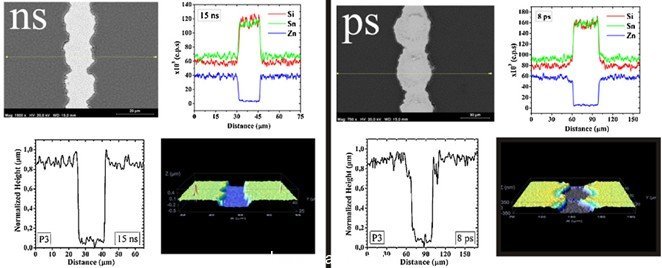 圖 ns和ps輻射下激光最佳劃線的EDX剖麵,SEM圖像和共焦剖麵以及地形圖