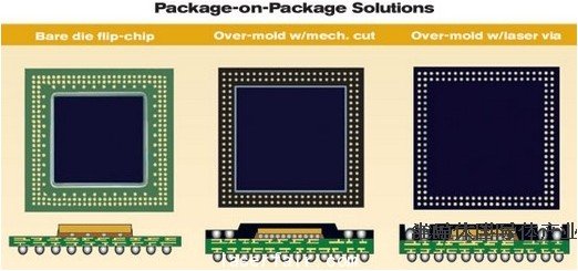 圖3. 存在多種窄互連節距PoP解決(jue) 方案,包括裸片型倒裝芯片方案、采用機械切割的模塑方案以及采用激光打孔的模塑方案。