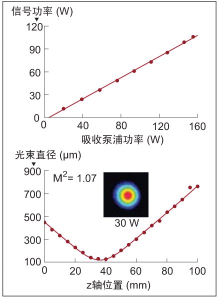 芯徑為(wei) 35μm、摻鐿和未摻鐿(Yb3+)芯層的兩(liang) 種手征性耦合芯徑光纖,可作為(wei) 增益光纖並應用於(yu) 無源光纖元件結構中。針對光纖在MOPA(主控振蕩器功率放大器)結構內(nei) 性能的實驗室測試結果表明,其產(chan) 生的平均功率超過100W,脈寬為(wei) 10ns,在100kHz脈衝(chong) 重複頻率下的峰值功率達到了100kW(見圖4)。[4]