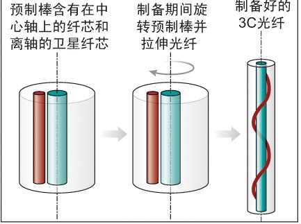 圖3:當3C光纖拉製時同時旋轉預製棒,使離軸的衛星纖芯螺旋型圍繞在中心纖芯周圍,產(chan) 生了所需的螺旋。