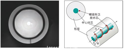 圖1:手征性耦合芯徑光纖使用1根中心導引纖芯,以及至少1根螺旋型圍繞在中心纖芯周圍的衛星纖芯。插圖所示的是光纖端麵。