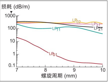 圖2:計算得到芯徑為(wei) 35μm、螺旋周期為(wei) 9mm的特定3C光纖的模式損耗。其中,LP01基模的損耗小於(yu) 0.2dB/m,而高階模的損耗大於(yu) 100dB/m。[2]