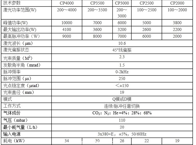 2000W-4000WCP係列激光器是由我公司在北美普瑞瑪上一代激光器產(chan) 品基礎上,自主研發的最新一代工業(ye) 用直流激勵軸快流CO2激光器。 CP係列激光器高質量的光束適合於(yu) 廣泛的材料加工應用。它采用了最新的激光器設計理念,簡潔明了, 易於(yu) 裝配和操作,可滿足在質量、速度和可靠性方麵的最高綜合要求。 出眾(zhong) 的技術 CP係列激光器在不變形諧振腔、高效DSP激光電源、無汙染氣體(ti) 循環係統以及PLC整體(ti) 自動控製方麵采用 了最新的技術。所有這些高品質的集合,成就了新—代高效率、低氣耗,緊湊可靠的工業(ye) 用高功率激光器。 多功能性 CP係列激光器具有多功能性,能提供連續和脈衝(chong) 方式的激光束,光束性能穩定。能夠滿足對各類不 同厚度材料的高質量標準的加工應用要求.實驗表明,尤其適合於(yu) 堅韌的不鏽鋼和厚碳鋼板的加工要求。 可靠性和兼容性 CP係列激光器具有長時間工作的可靠性及加工參數穩定性,使用成本低,操作便捷、安全。 當配備Windows操作係統的CNC控製時,激光器可由隨機提供的功能強大的在線軟件進行監控。 獨立開發出的CNC控製專(zhuan) 門模塊,實現了激光器與(yu) 數控機床的無縫對接。 不需要單獨配備監控激光器的主服務器, 兩(liang) 者之前的通訊更加快速通暢,故障點更少,工作更為(wei) 穩定可靠,為(wei) 廣大用戶帶來了持久的盈利空間與(yu) 保障。 主要特性 工作方式可以在連續、脈衝(chong) 或增強脈衝(chong) 之間任意切換 響應速度快 不變形諧振腔和獨特的放電結構保證了激光器即使在滿負荷工作下也能得到長期穩定的高品質激光輸出。 長壽命 固態高效直流激勵激光電源; 基本PLC的內(nei) 置式綜合診斷係統, 使用可靠,操作維護成本低 隻需從(cong) 單麵進行維護; 占地麵積小(不到90立方尺) 諧振腔特性 精密加工的鋁合金端板和不變形光橋材料,增加了光學穩定性 基於(yu) 應力平衡的先進機械設計 懸浮式的光腔設計保證了極好的光束質量和指向穩定性; 外殼接地,使用安全 隻有四個(ge) 內(nei) 部光學元件 高壓電源特性 峰值脈衝(chong) 功率達到額定功率的2.5~3倍 具有過流、過壓溫度保護與(yu) 報警措施,工作可靠性高 High voltage power supply features 控製及接口 功能強大,模塊化,緊湊的可編程控製器(PLC).多功能接口選項:激光器可由CNC控製或 由其它的遠程控製器進行控製。高功率特性 在薄板切割、焊接時的速度更快,在厚板切割品質和 速度上的表現更為(wei) 優(you) 異,CP 4000可高效穩定地切割25mm以內(nei) 碳鋼、12mm以內(nei) 鋁合金、 15mm以內(nei) 不鏽鋼以及30mm以內(nei) 的木板、金屬或非金屬等材料。 #p#分頁標題#e#激光器參數表 |
