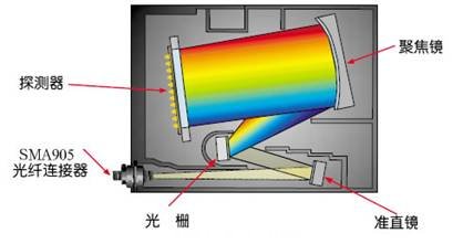 信號光由一個(ge) 標準的 SMA905 光纖接口進入光學平台,先經一個(ge) 球麵鏡準直,然後由一塊平麵光柵把該準直光色散,經由第二塊球麵鏡聚焦,最後光譜的象就被投射到一塊一維線性探測器陣列上。