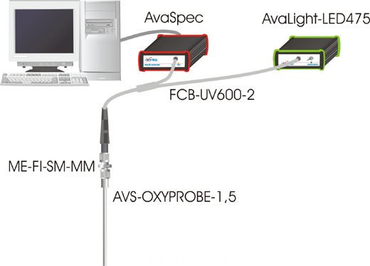 氧含量分析光纖探測係統是由在端麵加上專(zhuan) 利膜層的熒光光纖探頭、一個(ge) 藍光LED激勵源和高靈敏度AvaSpec微型光譜儀(yi) 組成。 該係統采用熒光探測技術來測量氧絕對濃度。光纖把藍光LED發射的光傳(chuan) 導到探頭端麵的薄膜上。激發出的熒光反射到光譜儀(yi) 的探測器上。當氣態或液態樣品中的氧擴散到薄膜上時,就會(hui) 使熒光淬滅,熒光的淬滅程度與(yu) 氧含量相關(guan) 。 AvaSoft-OXY應用軟件即可以用來校準傳(chuan) 感器,又可以監測氧含量。下圖為(wei) 氧含量測量的典型裝置。 |