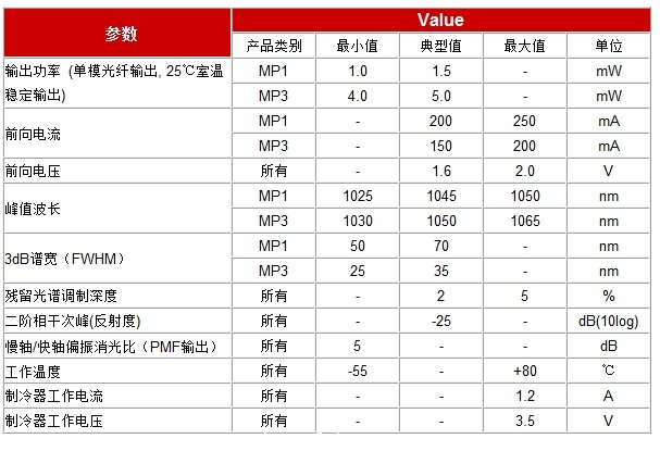 | 中等輸出功率 三種輸出功率範圍可選 光譜平坦,極低的殘留FP調製深度 非常寬的光譜寬度 |
