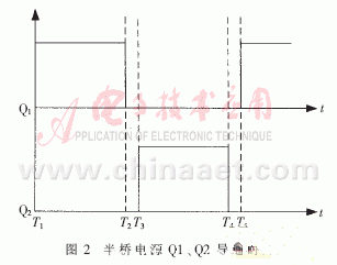主電路如圖1所示。L1~L4、C1、C2構成網路濾波電路,R為(wei) 熱敏電阻,限製係統上電和逆變啟動瞬間的浪湧電流。Q1、Q2為(wei) IGBT,與(yu) 無感電容C3、C4構成逆變電路,Q1、Q2的導通時序如圖2。在T1~T2階段,Q1導通,電容C3經由Q1、T、Cg放電,同時對C4進行充電。T2~T3階段,為(wei) 死區時間,Q1、Q2均截止。在T3~T4階段,Q2導通,工作原理與(yu) T1~T2階段相同,電流方向相反。T4~T5階段與(yu) T2~T3階段相同。這樣在一個(ge) 開關(guan) 周期內(nei) 在高壓包初級端上形成15 kHz的交變方波。經過升壓整流後向激光管提供連續電壓,通過調節開關(guan) 管的占空比,可改變高壓包次級輸出平均電壓。Q1、Q2的耐壓值應大於(yu) 2×160 V,電流應大於(yu) 3×Pout/160。本設計中要求激光器最大輸出功率為(wei) 180 W,假設能量轉換效率為(wei) 20%,則Pout=900 W,所以Q1、Q2電流應為(wei) 16.875 A。考慮開關(guan) 管的質量與(yu) 變壓器輸入電壓的偏差,選取額定電流大於(yu) 20 A,采用FGA25N120ANTD[5]。