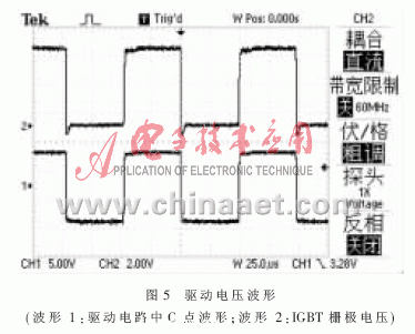 R31、R43用於(yu) 抑製IGBT驅動脈衝(chong) 的尖峰,R29//C23、R41//C27可以防止驅動脈衝(chong) 產(chan) 生振蕩。IGBT柵極電壓波形如圖5中波形2所示。