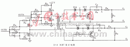 驅動電路采用脈衝(chong) 變壓器驅動隔離電路。SG3525的輸出經過推挽電路後,兩(liang) 路相位相反的脈衝(chong) 波加至脈衝(chong) 變壓器原邊的兩(liang) 端構成差分輸入,形成交變驅動,兩(liang) 路隔離的輸出分別經二極管整流後驅動IGBT。驅動電路如圖4所示,其中,G1、E1和G2、E2分別接Q1柵極、發射極和Q2柵極、發射極。