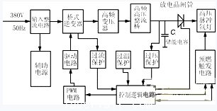 圖1示出電源原理框圖,整個(ge) 電路可分為(wei) 主電路(電力變換電路)和控製電路兩(liang) 大部分。來自電網的380V交流電壓經整流濾波後得到約520V左右的直流電壓,加到橋式逆變器上。逆變器主功率開關(guan) 采用三菱公司的CT60型IGBT管。PWM電路產(chan) 生一對相位互差180°的脈衝(chong) 電壓控製逆變橋的四個(ge) 功率管,將直流電壓變換為(wei) 高頻方波電壓,再經高頻高壓整流橋得到高壓直流(約1400V),向儲(chu) 能電容Co充電。電容Co上電壓充到預定值(1000V)後,控製電路發出信號,將放電晶閘管觸發導通,Co上電壓快速向負載氙燈釋放,激光器正常工作。