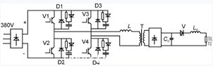 圖2示出電源主電路,V1—V4組成橋式逆變器,兩(liang) 端並聯RCD吸收支路,L為(wei) 限流電感,Co為(wei) 儲(chu) 能電容,Lo