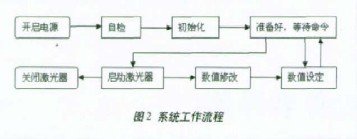 係統工作流程如圖2所示。上電以後,係統開始自檢,自檢完成後,進入係統初始化,包括DSP、DAC、LCD,以及DSP內(nei) 部的中斷控製器和計數器等。係統準備好 後,進入開機畫麵。開啟鍵盤中斷等待按鍵選擇相應功能。若“參數設定”為(wei) 選中狀態,按下工作鍵,進入“參數設置”界麵,可以對電壓、電流和功率值進行設 定。設定完成,返回開機畫麵,啟動激光器工作。係統進入運行狀態後,用戶仍然可以在不終止激光器工作的情況下設置新值,設定完備後,激光器按新要求輸出激光。