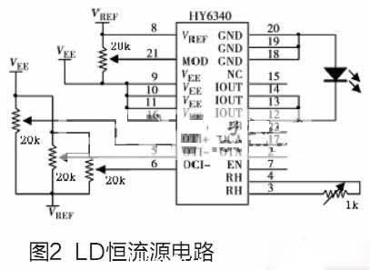 LD供電電路是一個(ge) 恒流源(見圖2)。ETC公司恒流源驅動芯片HY*0為(wei) 核心元件。供電電壓VEE的穩定對輸出恒流信號的穩定起著重要作用,因此采用多重濾波技術,將VEE的紋波控製在lmV以下,保證HY*0芯片輸出端12、13、14引腳信號的穩定。調節5引腳和6引腳到VEE之間的電壓可以分別設定過流保護閥值和過溫保護值。在恒定電流工作方式下,通過調節21引腳的輸出電平來控製輸出電流的大小在0~1.5A之間連續可調。
