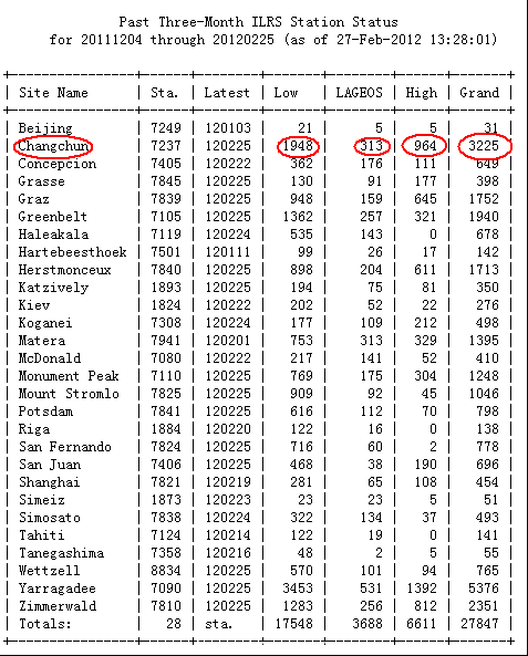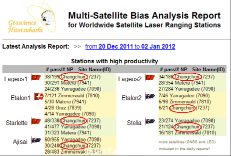 2011年12月,長春觀測站單顆衛星激光測量,Lageos1和Lageos2衛星及近地衛星Starlette測量名列國際第一名,遠地衛星Etalon2及近地衛星Ajisai、Stella的測量也名列國際前三名。