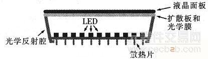 本文以一款66cm LED背光源為(wei) 目標進行設計。考慮到背光源所需要的亮度較大,使用LED的數目較多,而且需要大的散熱麵積,所以采用直下式背光結構。圖1是直下式LED 背光源示意圖,包括一個(ge) 光學反射腔作為(wei) 整體(ti) 結構的支撐、和散熱片結合的LED陣列、由擴散板和光學膜組成的背光源出光麵,最後和液晶麵板構成液晶麵板模組。