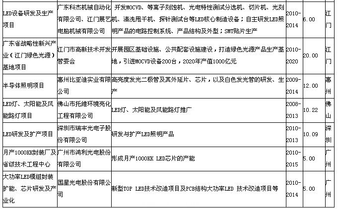 廣東(dong) 省總投資3885.88億(yi) 元建設148個(ge) 戰略性新興(xing) 產(chan) 業(ye) 重大項目,其中LED產(chan) 業(ye) 總投資116.36億(yi) 元,重大項目共計13項,如下表所示: