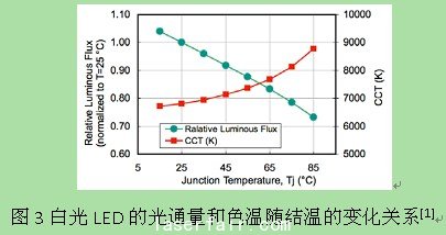 封裝LED的光色參數一般是在PN結為(wei) 25±1℃的條件下給出的,而在實際工作中,結溫通常高於(yu) 25℃,其光色性能會(hui) 發生較大變化,這也給封裝LED的應用帶來困擾。因此,有必要監測LED的光色參數隨結溫變化的情況,如圖3所示。光色參數隨PN結溫度變化曲線的測量與(yu) K係數的測量方法類似。