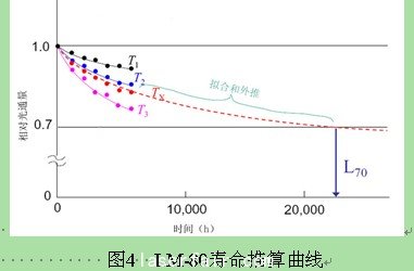 與(yu) 傳(chuan) 統照明產(chan) 品不同,LED產(chan) 品的壽命終了主要表現為(wei) 光衰到一定程度,如衰減到50%或70%流明維持率,即L50或L70。現有的國際標準或國家標準中除了對壽命時間提出要求外,一般還要求燃點3000h時光通維持率應不低於(yu) 92%,在燃點6000h時其光通維持率應不低於(yu) 88%;也有標準根據6000h時的光通維持率對LED進行等級分類。美國標準LM-80-08主要針對封裝LED及LED模塊的光通維持壽命測量,它提出了在三個(ge) 外殼溫度下測量LED的光通維持率,分別為(wei) :85ºC ,55ºC 和製造商選擇的溫度,在高溫下老練LED,主要是為(wei) 了模擬被測LED的實際工作環境。老練測試時間為(wei) 6000小時,可根據測試的數據進行外推計算獲取LED的壽命時間。如圖4所示為(wei) 壽命推算曲線: