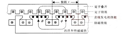 德國TR 型磁懸浮列車無接觸式的牽引技術要求采用長定子同步直線電機驅動。 電機定子鐵心由015 mm 厚的電工鋼片疊壓而成,被固定在導軌的下部;定子三相繞組由防護電纜組成,預先成形,並由敷線車將其嵌放在導軌兩(liang) 側(ce) 的定子槽中。 定子三相繞組通電後,產(chan) 生一個(ge) 移行磁場,與(yu) 布置在車輛上的懸浮(勵磁) 磁鐵相互作用,實現牽引。 其工作原理如圖1 所示。