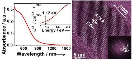 硒化錫是一種重要的IV-VI族半導體(ti) ,其體(ti) 相材料的間接帶隙為(wei) 0.90 eV,直接帶隙為(wei) 1.30 eV,可以吸收太陽光譜的絕大部分;作為(wei) 一種含量豐(feng) 富、環境友好且化學穩定的半導體(ti) 材料,硒化錫是新型太陽能電池潛在候選材料之一,因此其納米材料的合成受到人們(men) 的關(guan) 注。本工作利用溶液化學的優(you) 勢,采用晶種誘導的方法首次生長了直徑約20nm的SnSe單晶納米線,長度從(cong) 數百納米到數十微米可調。光譜表征表明,硒化錫單晶納米線顯示明顯的量子限域效應:其間接和直接帶隙分別達到1.12 eV和1.55 eV, 分別與(yu) 太陽能電池材料Si和CdTe的帯隙非常接近,顯示出該材料在發展新型太陽能電池方麵的潛力。