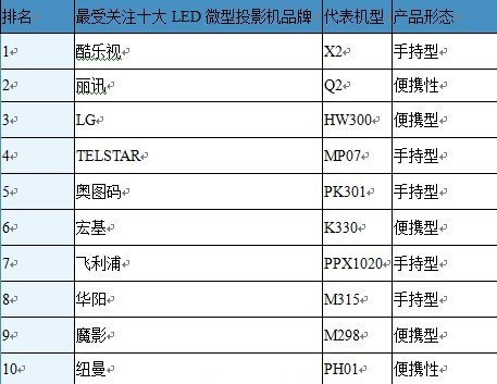 市場中的主要品牌及廠商包含了:大陸本土品牌(製造商):深圳酷樂(le) 視COOLUX、TELSTAR(昱為(wei) )、MILI、紐曼、愛國者、魔影、泰達日精TRT、惠州華陽(foryou)、中光學、廣州晶華JOC、深圳雅圖、四川長虹、天津美高、上海三鑫(laseno)。台係品牌及海外公司、品牌,主要是:奧圖碼optoma、宏基acer、優(you) 派viewsonic、麗(li) 訊vivitek、3M、飛利浦、LG、三星、NEC、華碩、ASK、戴爾DELL、惠普HP。
