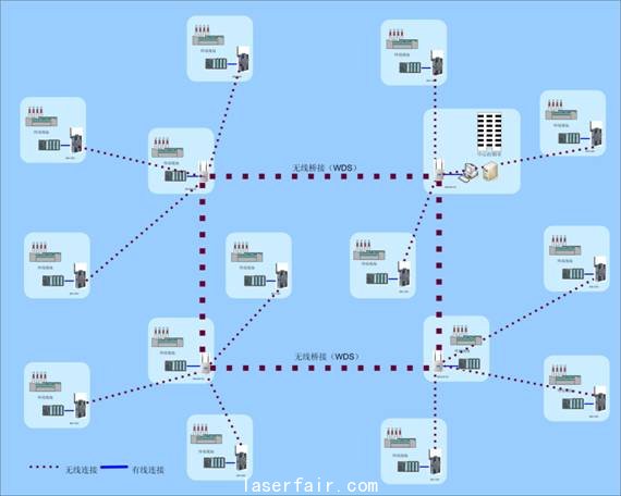 本方案主要采用研華無線AP EKI-6311G與(yu) 無線串口服務器EKI-1351兩(liang) 種設備。由於(yu) 現場有100個(ge) PLC設備,且每台PLC均需要采用無線方式傳(chuan) 輸至上位機。由於(yu) 現場PLC與(yu) 中控室距離較遠,且無線節點較多,為(wei) 保障無線網絡傳(chuan) 輸的可靠,因此我們(men) 推薦每10台PLC透過1台無線AP連接,即總共需10台無線AP。無線AP間采用WDS (Wireless Distribution System無線分布式係統) 技術,讓無線網絡的多台無線AP設備靈活的橋接,方便的把100台PLC的數據透過100個(ge) EKI-1351傳(chuan) 輸至無線AP,最終再上傳(chuan) 至中控室的上位機。