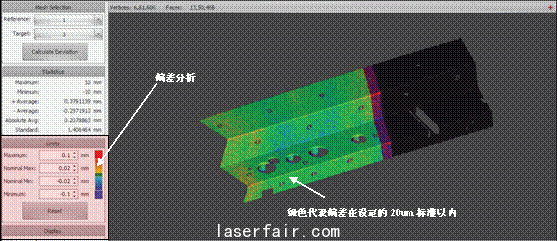 在機械配件掃描應用中,另外一種需求是對掃描件的三維機械尺寸進行分析和檢測,以便進行產(chan) 品質量控製。RASCO利用HDI ADVANCE的偏差分析功能,與(yu) Geomagic配合可以提供精準的數字、圖形數據比較報告,允許配件製造商客戶在產(chan) 品大批量生產(chan) 之前就發現問題,節約成本和時間。