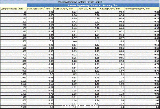 通常情況下根據形狀和大小的不同,掃描儀(yi) 1個(ge) 零件或組件,RASCO的會(hui) 進行15~50次掃描,最後使得整體(ti) 精度在20um到35um之間。掃描一個(ge) 整車會(hui) 需要更多的時間,整體(ti) 精度則會(hui) 取決(jue) 拚接操作的合理性,以下是RASCO采用HDI ADVANCE進行不同大小物體(ti) 掃描可達到的掃描精度列表。