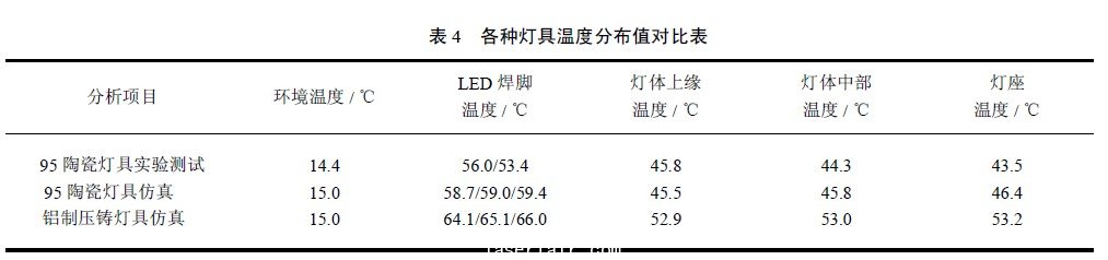 陶瓷燈具的燈座為(wei) 95陶瓷材料(鋁製壓鑄燈具的燈座為(wei) PBT塑料),各部件得到了充分的利用。實驗測試時,1.0h基本達到熱平衡,環境溫度的算術平均值約14.4℃,將實驗測試和計算機仿真的溫度分布值進行分析比較,結果見表4所示。