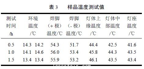 本次進行溫度測試的方法為(wei) 熱電偶測試法。LED焊腳測試點為(wei) 兩(liang) 處,燈體(ti) 散熱器測試點為(wei) 三處,環境溫度采用兩(liang) 根熱電偶測試,測試結果如表3所示。