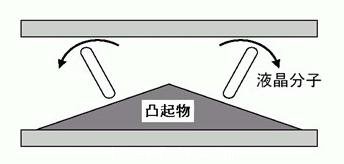 它叫做Protrusion的屋脊狀凸起物來使液晶本身產(chan) 生一個(ge) 預傾(qing) 角(Pre-tilt Angle)。這個(ge) 凸起物頂角的角度越大,則分子長軸的傾(qing) 斜度就越小。早期的VA模式液晶凸起物隻在一側(ce) ,後期的MVA凸起物則在上下兩(liang) 端。
