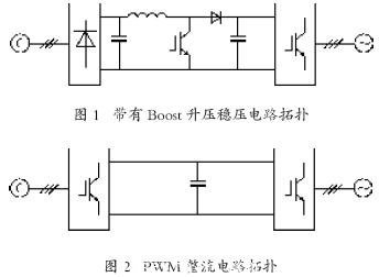MW級大功率直驅式並網變流器采用多單元並聯結構,單個(ge) 單元的主電路拓撲采用交-直-交電壓型結構,如圖1或圖2 所示,圖1采用二極管不控整流和Boost升壓穩壓電路,圖2采用PWM全控整流電路。