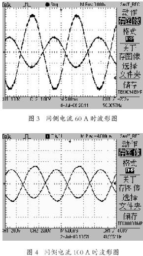 圖3 是並網電流為(wei) 60 A 時的網側(ce) 電壓電流波形圖,圖4是並網電流為(wei) 100 A時的網側(ce) 電壓電流波形圖。從(cong) 兩(liang) 圖可以看出,網側(ce) 電流正弦化,且與(yu) 電網電壓反相,呈現負的單位功率因數,同時也能觀察到隨著電流的增大,網側(ce) 電流的諧波失真係數(THD)越來越小,即整體(ti) 效率越來越高。