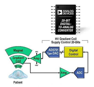 不同係統的成像能力也存在差別。X射線技術非常適合用於(yu) 診斷骨骼疾病。超聲利用聲波來監視胎兒(er) ,可對器官以及心房、心室、血管中的血流情況成像。MRI則適合對軟組織進行成像。對於(yu) 上述各種醫學成像係統,ADI公司都有相應的專(zhuan) 業(ye) 技術解決(jue) 方案。本文重點介紹一款針對磁共振成像(MRI)等高性能應用而開發的新型高分辨率DAC。
