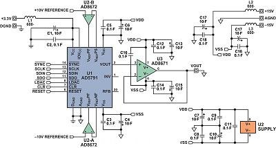 AD5791是一款單通道、20位、電壓輸出型DAC。為(wei) 實現高動態範圍,該器件必須采用高電源電壓工作,因為(wei) 電源電壓越高,則越容易遠離噪底。這對AD5791來說不是一個(ge) 問題,其電源電壓VDD的範圍是7.5 V至16.5 V,VCC的範圍是–7.5 V至–16.5 V。