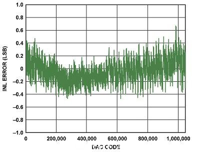 基準輸入電壓可在±10 V範圍內(nei) 選擇。由於(yu) 基準電壓範圍如此之寬,因此LSB電平最高可以達到20 µV。這有助於(yu) 轉換器保持20位(1ppm)的積分和微分非線性(INL和DNL),如圖4a/b所示。