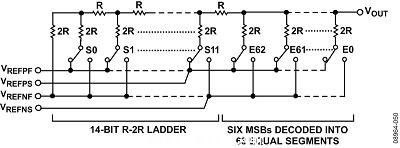 該DAC的架構由一個(ge) 校準的電壓模式R2R梯形網絡組成。用於(yu) 構建轉換器內(nei) 核的薄膜電阻能夠提供出色的匹配能力和穩定度。為(wei) 實現高線性度,R2R電阻梯分為(wei) 兩(liang) 段。一個(ge) 14位R2R梯形網絡產(chan) 生低14位(S0至S13)。20位數字碼的其餘(yu) 高6位用來驅動一個(ge) 獨立的6位DAC,它控製低14位的基準電壓。這兩(liang) 部分共同構成一個(ge) 性能出色的乘法DAC主體(ti) 。圖3顯示了該器件中實現的R2R梯形結構。